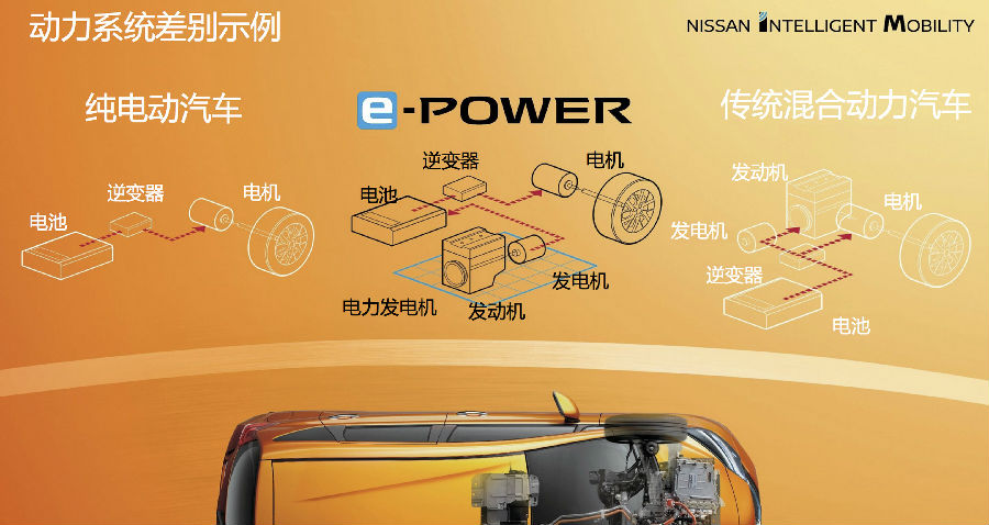 注:日產e-POWER動力系統在分類上屬于串聯式混合動力。日產混合動力汽車NOTE e-POWER標志著首款搭載串聯式混合動力系統的緊湊型車型的量產。
