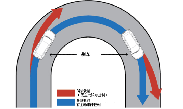如果系統(tǒng)判定車輛偏離了轉(zhuǎn)向線路,主動(dòng)跟蹤控制可以在轉(zhuǎn)彎的(入彎、過(guò)彎、出彎)任何時(shí)間點(diǎn)介入。通過(guò)自動(dòng)、平順地對(duì)各車輪施加一點(diǎn)剎車,系統(tǒng)會(huì)糾正車輪軌道,使車輛按照駕駛員的指令行駛,增加駕駛員在過(guò)彎時(shí)的信心。舉例來(lái)說(shuō),如果車輛入彎時(shí)速度過(guò)快,車輛容易向彎道外側(cè)偏移,而主動(dòng)跟蹤控制系統(tǒng)將會(huì)逐漸地、平順地糾正車輪的轉(zhuǎn)彎路線,使車輛回到正確的轉(zhuǎn)向線路。當(dāng)車輛駛出彎道時(shí),系統(tǒng)也可以介入。舉例來(lái)說(shuō),如果駕駛員加速出彎時(shí)速度過(guò)快,車輛容易向外偏移,主動(dòng)跟蹤控制系統(tǒng)將平順地對(duì)內(nèi)側(cè)車輛使用剎車,幫助車輛回到正確的轉(zhuǎn)向線路上來(lái)。