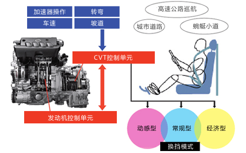 該系統將行駛狀況和行駛動態傳輸至CVT控制單元,以便選擇最適合當前行駛情況的變速模式。