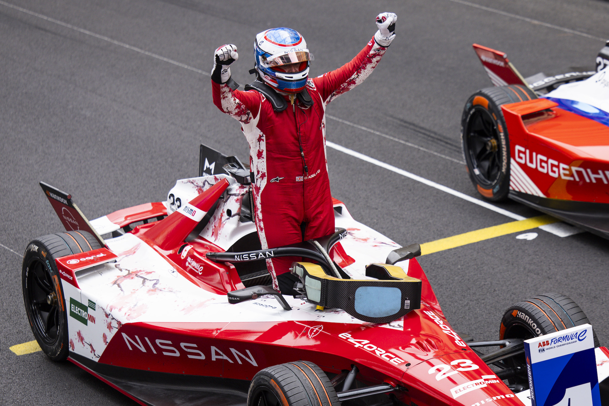 正賽中,羅蘭德作為車手積分榜的領(lǐng)跑者,在濕滑且棘手的賽道保持了自己的位置,但隨后因周圍車手啟用攻擊模式(Attack Mode)而暫時(shí)落至第二名。他展現(xiàn)出卓越的速度,成功抵擋住了競(jìng)爭(zhēng)對(duì)手的攻勢(shì),并在第18圈激活了他本場(chǎng)首次、時(shí)長(zhǎng)四分鐘且額外增加50千瓦功率的攻擊模式(Attack Mode)。盡管這位英國(guó)車手因需要不得不讓回一個(gè)位置,但他奮力拼搏,最終奪得亞軍。